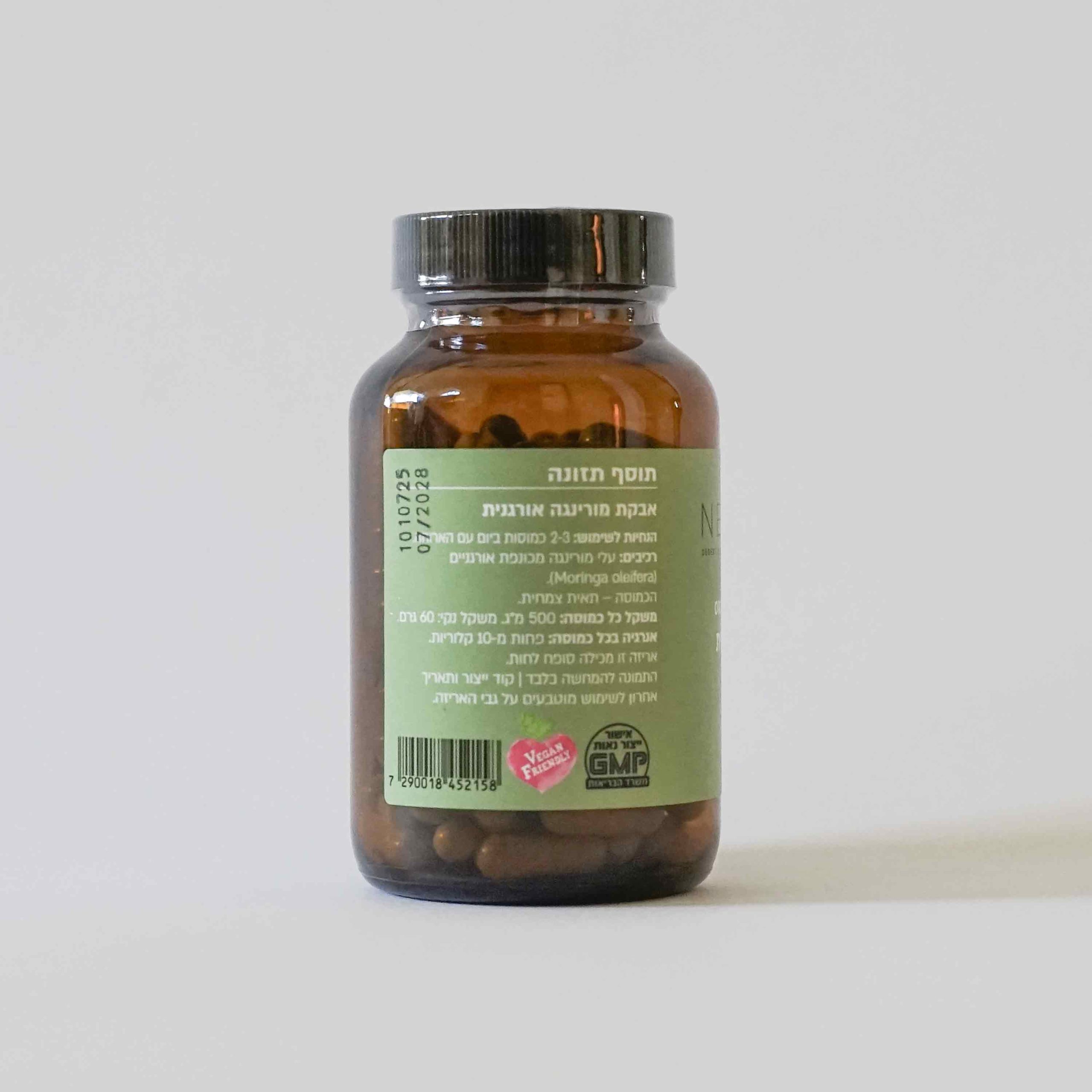 מורינגה (Moringa oleifera) היא עץ הגדל בהודו ובאפריקה ונחשב לאחד מצמחי המרפא העשירים ביותר ברכיבים תזונתיים בטבע. העלים שלו מיובשים ונטחנים לאבקה ירוקה מרוכזת, המשמשת כסופר־פוד טבעי לתמיכה יומיומית בגוף.